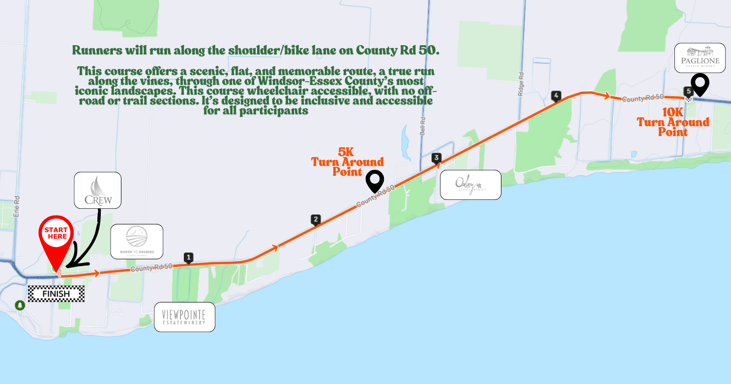 This course offers a scenic, flat, and memorable route — a true run along the vines, through one of Windsor-Essex County’s most iconic landscapes. This course is fully paved and wheelchair accessible, with no off-road or trail sections. It’s designed to be inclusive and accessible for all participants.